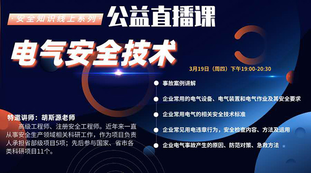 3月19日晚,我院磁傳動設備廠職工再次來到疫情期間企業復工復產安全知識線上公益系列課程直播間,今天的課程是注冊安全工程師胡斯源老師分享的《電氣安全技術》。