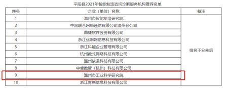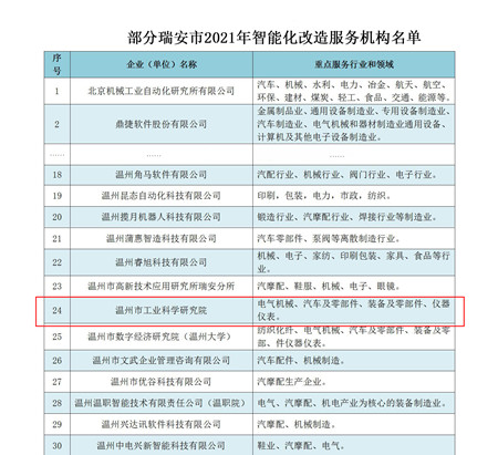 近日,樂清市經信局、平陽縣經信局、瑞安市經信局分別公布了《關于2021年智能化改造咨詢診斷服務機構遴選結果的公示》、《關于平陽縣2021年智能制造咨詢診斷服務機構推薦名單公示》和《瑞安市2021年智能化改造服務機構的通知》,我院成功入選三大縣市服務機構名單。
